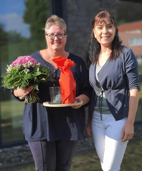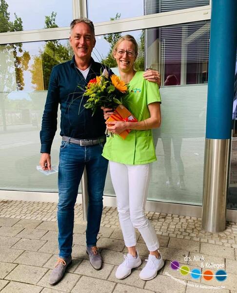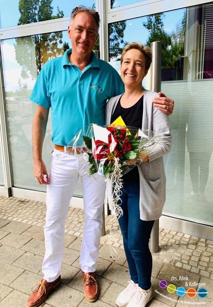 Die beiden haben aber auch Grund genug, denn unsere Iris ist nun schon 20 Jahre für Herrn drs. Alink in der Stuhlassistenz tätig!