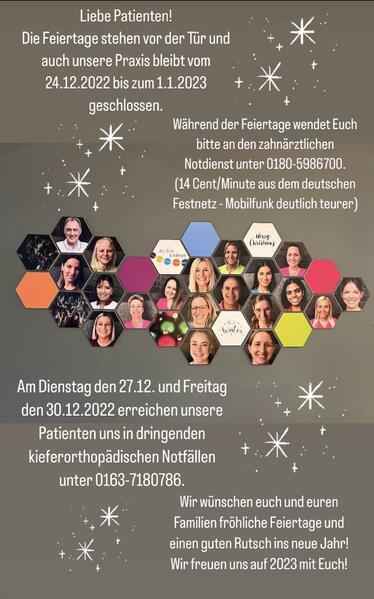 Am Dienstag den 27.12. und Freitag den 30.12.2022 erreichen unsere Patienten uns in dringenden kieferorthopädischen Notfällen unter 0163-7180786.