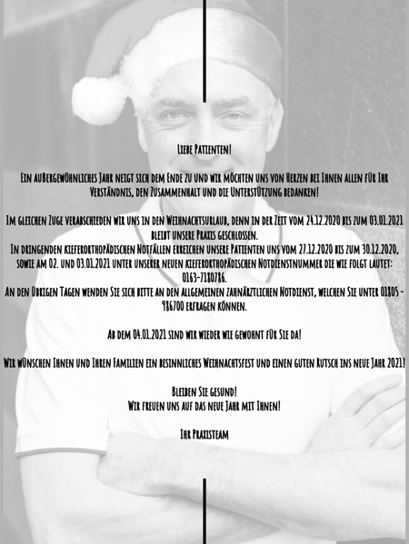 In dringenden kieferorthopädischen Notfällen erreichen unsere Patienten uns vom 27.12.2020 bis zum 30.12.2020, sowie am 02. und 03.01.2021 unter unserer neuen kieferorthopädischen Notdienstnummer die wie folgt lautet: 0163-7180786.